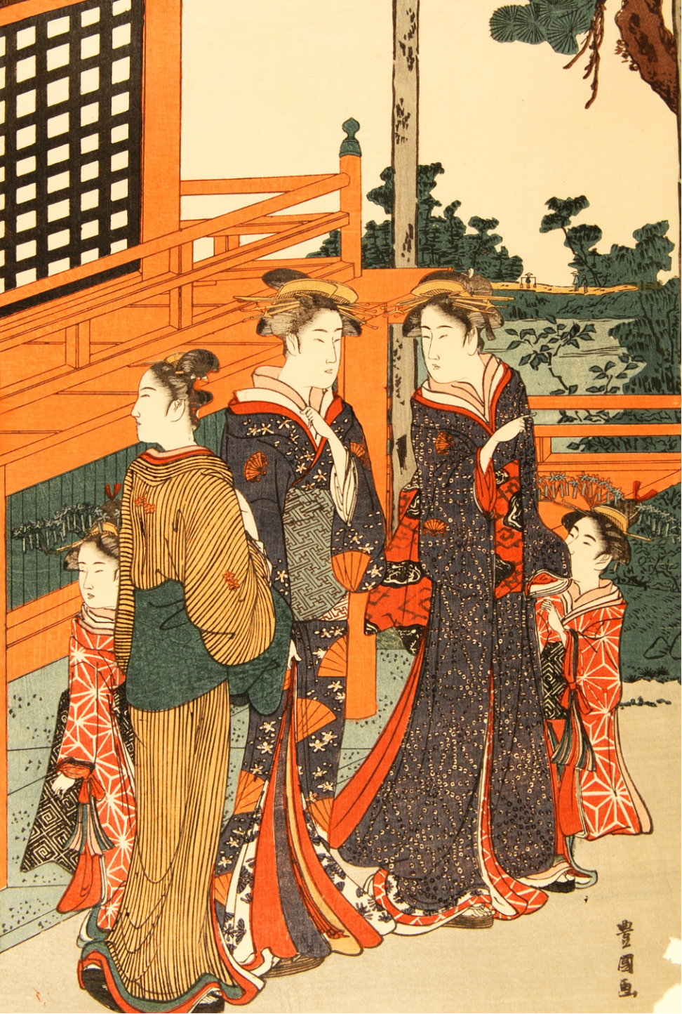 Affordable and portable, they let merchants and artisans—rich in cash, poor in status—step into the chic theater of the pleasure quarters. Hairpins, layered kimono, house crests, even a shrine outing like this one: every detail reads like a style guide and a city map. Publishers knew it. They watched trends, commissioned series, and refreshed faces with the seasons, turning bijin-ga [pictures of beautiful women] into a steady market—part fashion plate, part fan culture, part advertisement.This impression reproduces Toyokuni’s signature and the Utagawa School brand forward into the 1900s, when celebrated Edo designs were recut and reprinted for new audiences. What you hold, then, is both glamour and afterglow: a modern echo of the “floating world” and the everyday desire that kept it in print.